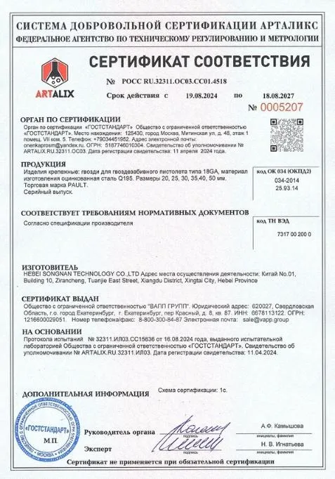 Сертификат соответствия гвозди 18GA PAULT