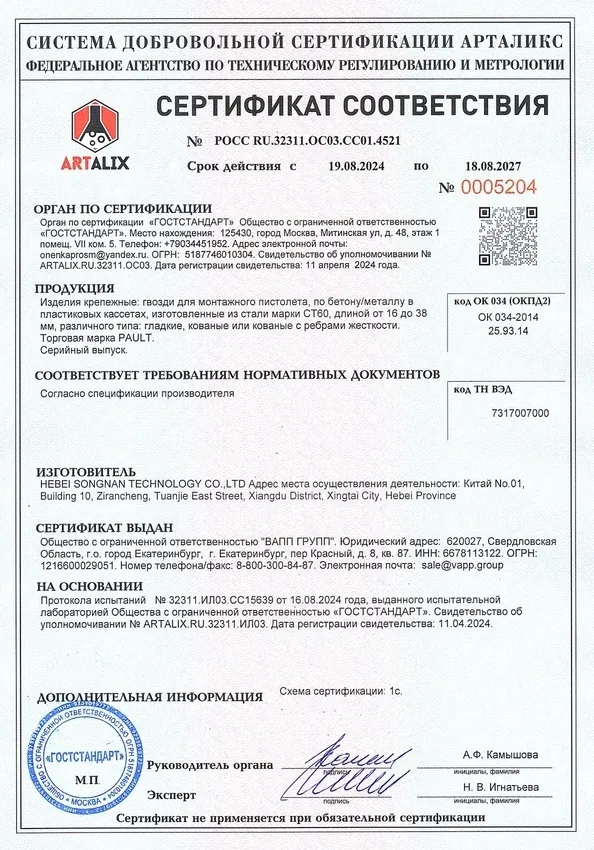 Сертификат соответствия гвозди по бетону PAULT