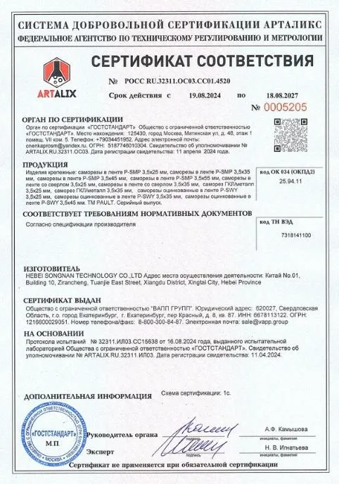 Сертификат соответствия саморезы в ленте PAULT