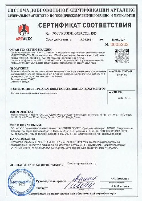 Сертификат соответствия тарельчатый дюбель PAULT