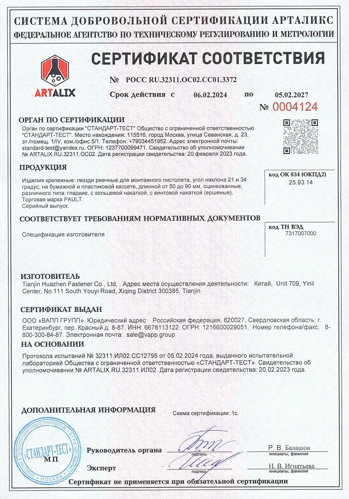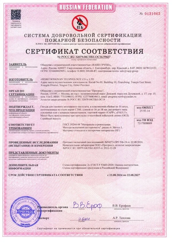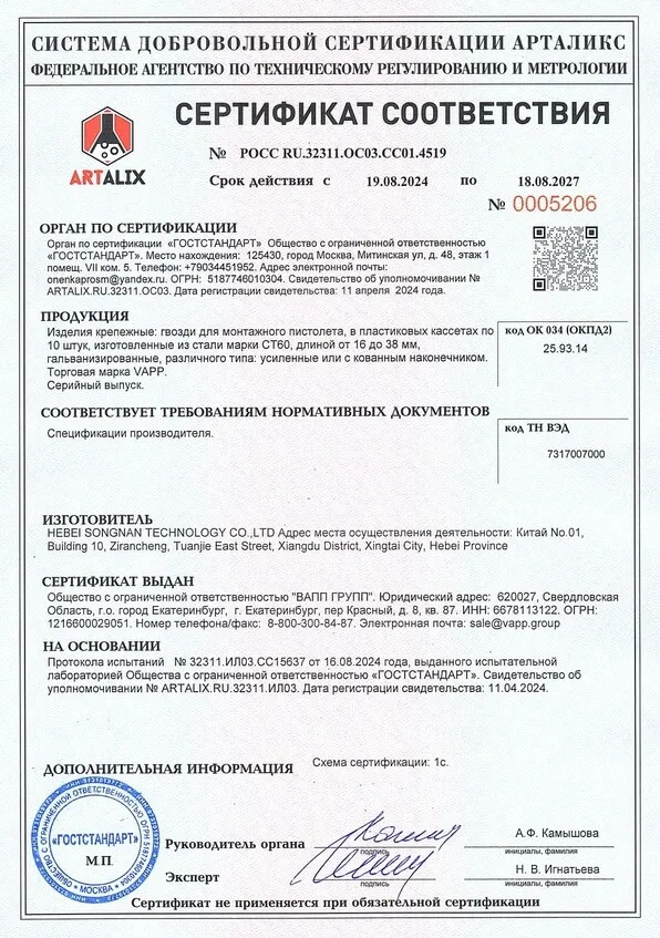Сертификат соответствия гвозди по бетону VAPP